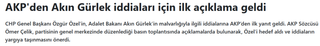 AKP Sözcüsü Ömer Çelik basın toplantısında Adalet Bakanı Akın Gürlek’in malvarlığı iddialarına ilişkin ilk resmi yanıtı vermiştir. Çelik doğrudan iddialara girmeyerek Özgür Özel’i hedef almıştır. İddiaların dedikodu niteliğinde olduğunu ve yalan çıktığını vurgulamıştır. Özel’in günlerdir açıklama yapacağını söyleyip ertelemesinin eleştirildiği bir üslup kullanılmıştır. Adalet Bakanı Akın Gürlek’in bu iddialara zaten yanıt verdiği hatırlatılmıştır. Siyasetin magazin derneği olmadığını belirten Çelik siyasi denklemin önemini dile getirmiştir. Bu açıklamalar siyasi gerilimi yeni bir seviyeye taşımıştır.