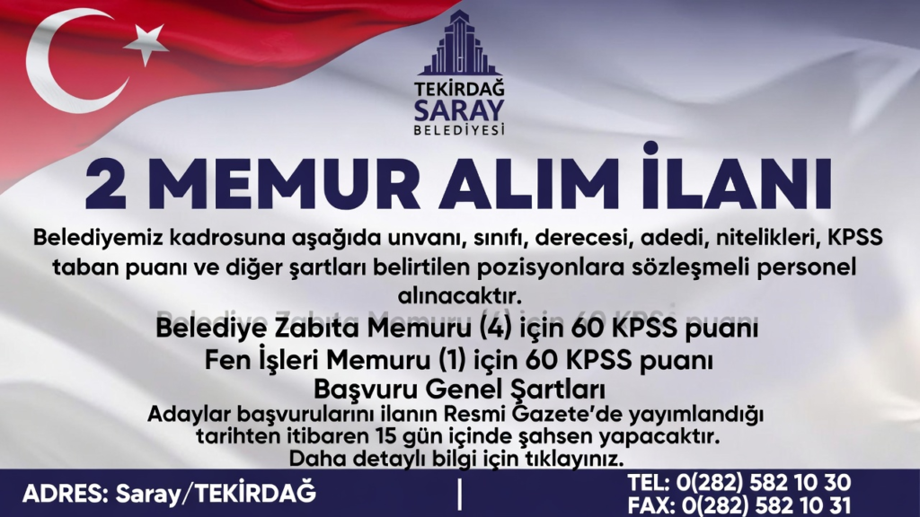 Tekirdağ’ın hızla gelişen ilçelerinden Saray’da belediye hizmetleri yeni bir ivme kazanmaya hazırlanıyor. Kamu sektöründe memur pozisyonları her zaman büyük bir fırsat olarak değerlendiriliyor. Özellikle teknik ve idari alanlardaki alım ilanları adayların kariyer hedeflerini şekillendiriyor.