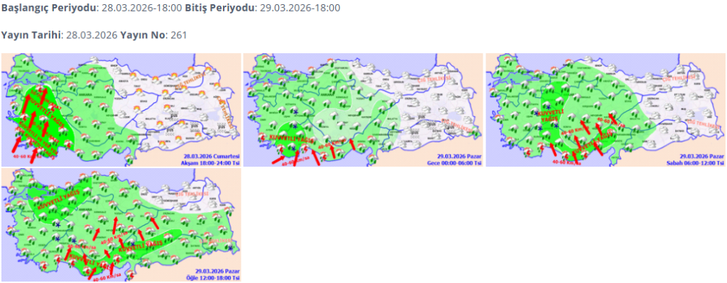 | Antalya | 13 | 18 | Parçalı çok bulutlu, aralıklı sağanak yağışlı | Yüksek, yerel kuvvetli, gök gürültülü | Güneyli yönlerden kuvvetli, kısa süreli fırtına (50-70 km/s) |