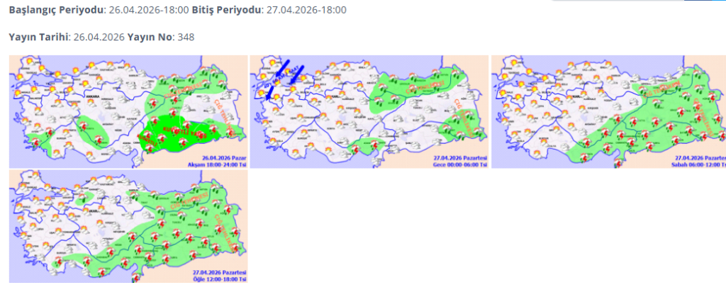 | 26 Nisan 2026 Akşam Saatleri | İç Ege, Akdeniz iç kesimleri, İç Anadolu güney ve doğusu, Doğu Karadeniz, Doğu ve Güneydoğu Anadolu, Hatay, Eskişehir, Ordu, Tokat, Samsun doğusu | Aralıklı sağanak ve gök gürültülü sağanak yağışlı, yer yer kuvvetli | Kuzey ve iç kesimlerde 2-4 derece artış, diğer bölgelerde değişiklik yok | Genellikle güneyli, hafif-orta kuvvette | Yer yer kuvvetli yağış, gök gürültüsü riski |