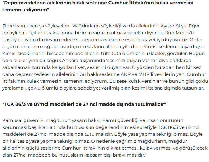 Bu çağrı, mağdurların ve ailelerinin seslerine kulak verilmesi gerektiğine vurgu yapıyor. Suiçmez, Cumhur İttifakı'na seslenerek, görüşülecek maddelerde bu hususların dikkate alınmasını ve kapsam dışı bırakılmasını istiyor. Meclis görüşmeleri sırasında bu eleştirilerin gündemde tutulacağını belirten milletvekili, düzenlemenin mağdur haklarını ön plana alacak şekilde yeniden gözden geçirilmesi gerektiğini ifade ediyor.