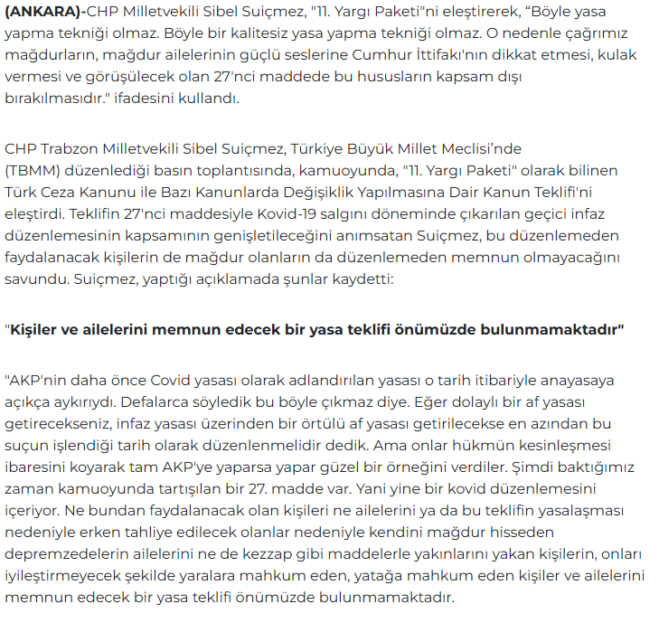 CHP Trabzon Milletvekili Sibel Suiçmez, Meclis'te düzenlediği basın toplantısında, kamuoyunda 11. yargı paketi olarak bilinen Türk Ceza Kanunu ile Bazı Kanunlarda Değişiklik Yapılmasına Dair Kanun Teklifi'ni sert bir şekilde eleştirdi. Suiçmez, yasa yapma tekniğinin kalitesizliğini vurgulayarak, "Böyle yasa yapma tekniği olmaz, böyle bir kalitesiz yasa yapma tekniği olmaz" ifadelerini kullandı. Bu sözler, düzenlemenin hazırlık sürecindeki eksikliklere dikkat çekiyor ve infaz hükümlerinin genişletilmesinin mağdurlar ile aileleri üzerinde yaratacağı olumsuz etkilere işaret ediyor.