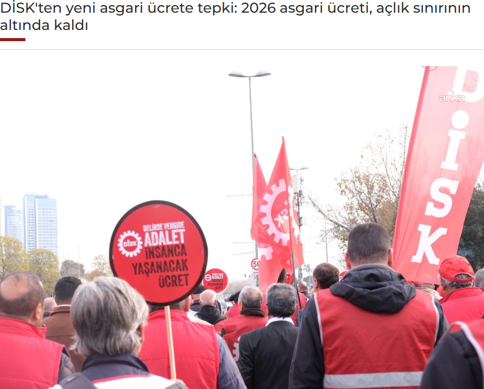 Devrimci İşçi Sendikaları Konfederasyonu (DİSK), karara sert tepki gösterdi. Açıklamada, 2026 asgari ücretin açlık sınırının bile altında kaldığı vurgulandı. Kasım 2025 verilerine göre dört kişilik bir ailenin açlık sınırı **29 bin 828 TL** seviyesindeyken, yeni ücret bu rakamın altında yer alıyor. Tarihte ilk kez asgari ücretin açlık sınırının altına düştüğü belirtilerek, işçilerin enflasyona ezdirildiği ifade edildi.