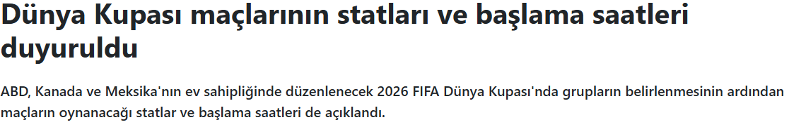 Sonuç olarak, 2026 FIFA Dünya Kupası'nın stat ve saat duyurusu, futbolseverleri Kuzey Amerika macerasına davet ediyor. Açılışın Meksika coşkusundan finalin New Jersey gerilimine, D Grubu'nun Türkiye randevularına uzanan bu program, turnuvayı efsaneleştirecek. Erken sabah seansları ve ikonik arenalar, unutulmaz anlar vaat ederken, taraftarlar bilet avına başlasın; zira bu şölen, tarih yazacak. Heyecan dorukta, top yuvarlanıyor – Dünya Kupası, kapıda!