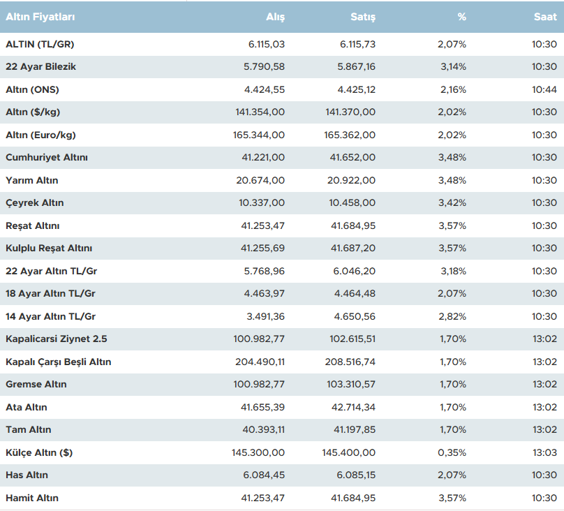 Diğer türlerde ise Kapalıçarşı ziynet 2.5 alış 100.982,77 TL, satış 102.615,51 TL ile yüzde 1,70 artış kaydediyor. Beşli altın alış 204.490,11 TL, satış 208.516,74 TL, Gremse altın alış 100.982,77 TL, satış 103.310,57 TL ve aynı oranlarda değerlenme gösteriyor. Külçe altın dolar bazında alış 145.300,00 dolar, satış 145.400,00 dolar ile yüzde 0,35'lik daha mutedil bir artış yaşıyor.