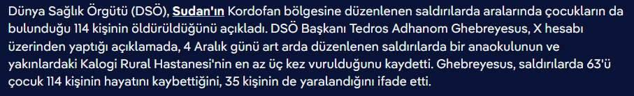 Sonuç olarak, Sudan'daki anaokulu saldırısı, iç savaşın vahşi yüzünü simgeliyor ve 63 çocuğun ölümüyle küresel bir utanç kaynağı haline geliyor. RSF'nin Kordofan hamlesi, Hartum'u tehdit ederken, petrol ve altın savaşları masumları eziyor. BM'nin uyarıları ve DSÖ'nün çağrıları, acil barış için yetersiz kalıyor; ancak bu trajedi, diplomatik baskıyı artırabilir. Sudan'ın geleceği, bu kanlı döngüden kurtuluşa bağlı; yoksa daha fazla anaokulu enkaza dönecek. Gelişmeleri izlemek, insanlığın vicdanını test ediyor.
