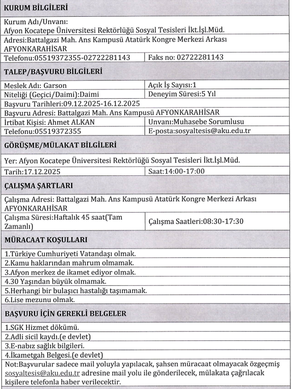 Çalışma koşulları ve ortamı hakkında da adayları bilgilendiren duyuruya göre, işe alınacak personel ANS Kampüsü içerisinde yer alan sosyal tesislerde görev yapacak. Haftalık çalışma süresi 45 saat olarak belirlenmiş olup, mesai saatleri sabah 08:30 ile akşam 17:30 arasında tam zamanlı bir düzeni kapsıyor. İlgili alım sürecinin takibi ve form onayı İşletme Müdürü Volkan Afacan tarafından yapılırken, süreçle ilgili daha detaylı bilgi almak isteyen adaylar İrtibat Kişisi Ahmet Alkan’a 0551 937 23 55 veya 0272 228 11 43 numaralı telefonlardan ulaşabilirler. Afyon’da yaşayan ve şartları taşıyan genç, dinamik ve deneyimli adayların bu süreyi kaçırmadan başvurularını iletmeleri büyük önem taşıyor.