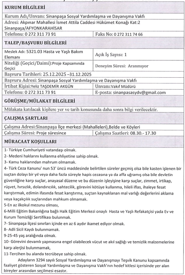 Başvuru süreciyle ilgilenen adayların, gerekli belgelerle birlikte şahsen Sinanpaşa Sosyal Yardımlaşma ve Dayanışma Vakfı’na müracaat etmeleri bekleniyor. İlgili alım süreci hakkında daha detaylı bilgi almak veya aklına takılan soruları sormak isteyen vatandaşlar, kurumun 0 272 311 73 91 numaralı telefon hattından iletişime geçebilirler. Mülakata katılmaya hak kazanan adaylara, başvuru sürecinin tamamlanmasının ardından ayrıca bilgilendirme yapılacağı ifade ediliyor. Yıl bitmeden iş sahibi olmak isteyen Sinanpaşalılar için bu ilan, 2026 yılına yeni bir başlangıçla girme fırsatı sunuyor.
