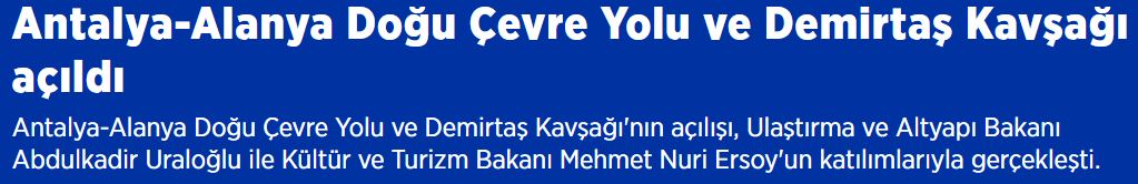 Büyük bir heyecanla gerçekleştirilen açılış töreni, Ulaştırma ve Altyapı Bakanı Abdulkadir Uraloğlu ile Kültür ve Turizm Bakanı Mehmet Nuri Ersoy'un katılımlarıyla yapıldı. Bölge halkının yoğun ilgi gösterdiği törenle birlikte, Antalya-Alanya Doğu Çevre Yolu ve Demirtaş Kavşağı resmen trafiğe açıldı. Modern ulaşım ağının en kritik halkalarından biri olan bu proje, sadece bir yol çalışması değil, aynı zamanda bölgenin turizm ve ticaret potansiyelini zirveye taşıyacak stratejik bir atılım olarak nitelendiriliyor. Açılan yeni hatlar sayesinde şehir içi trafik keşmekeşi son bulurken, transit geçişler de kesintisiz bir akışa kavuşuyor.