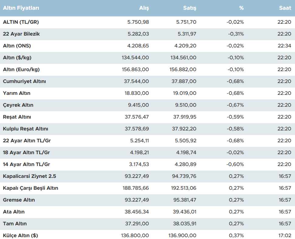 5 Aralık 2025 Cuma akşamı saat 19:23 itibarıyla Gram Altın alış 5.753,45 TL, satış 5.754,23 TL, değişim yüzde 0,02. 22 Ayar Bilezik alış 5.280,67 TL, satış 5.309,60 TL, yüzde -0,35. Cumhuriyet Altını alış 37.580,00 TL, satış 37.903,00 TL, yüzde -0,63. Yarım Altın alış 18.848,00 TL, satış 19.027,00 TL, yüzde -0,64. Çeyrek Altın alış 9.424,00 TL, satış 9.514,00 TL, yüzde -0,63. Reşat Altını alış 37.612,47 TL, satış 37.935,95 TL, yüzde -0,55. Kulplu Reşat Altını alış 37.614,69 TL, satış 37.938,20 TL, yüzde -0,54. Ata Altın alış 38.456,34 TL, satış 39.436,01 TL, yüzde 0,27 (saat 16:57). Tam Altın alış 37.291,00 TL, satış 38.035,91 TL, yüzde 0,27 (16:57). Hamit Altın alış 37.612,47 TL, satış 37.935,95 TL, yüzde -0,55. 22 Ayar Altın TL/Gr alış 5.259,22 TL, satış 5.508,24 TL, yüzde -0,64. 18 Ayar Altın TL/Gr alış 4.200,02 TL, satış 4.200,59 TL, yüzde 0,02. 14 Ayar Altın TL/Gr alış 3.177,67 TL, satış 4.282,48 TL, yüzde -0,56. Has Altın alış 5.724,69 TL, satış 5.725,46 TL, yüzde 0,02. Kapalıçarşı Ziynet 2.5 alış 93.227,49 TL, satış 94.739,76 TL, yüzde 0,27 (16:57). Kapalı Çarşı Beşli Altın alış 188.785,66 TL, satış 192.513,06 TL, yüzde 0,27 (16:57). Gremse Altın alış 93.227,49 TL, satış 95.381,47 TL, yüzde 0,27 (16:57). Gümüş TL/Gr alış 79,56 TL, satış 79,62 TL, yüzde 1,99 (19:23). Bu veriler, altının yıl sonuna doğru güvenli liman cazibesini koruduğunu gösteriyor; yatırımcılar, ons fiyatlarının 2.500 doları aşması durumunda yerel kurlarda yeni rekorlar bekleyebilir.
