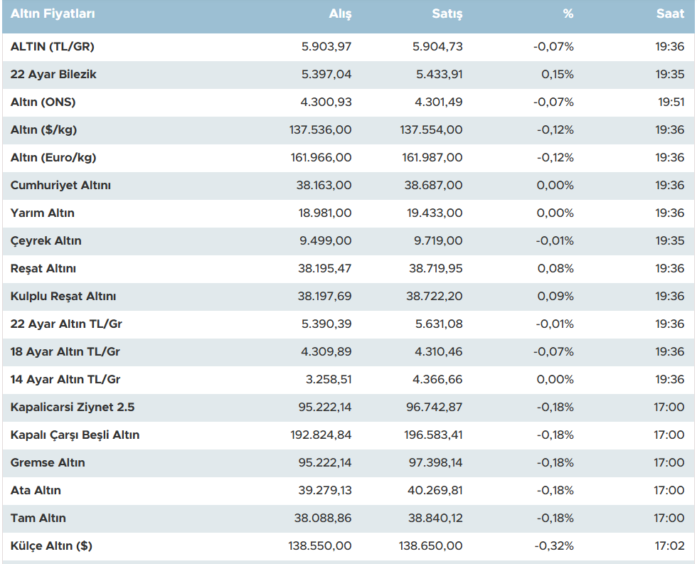22 ayar bilezik gramı alışta 5.427,41 TL, satışta 5.464,54 TL ve yüzde 0,72 artışla en güçlü yükselenlerden biri. Ons altın ise dolar bazında alış 4.322,37 USD, satış 4.322,93 USD ile yüzde 0,43 oranında değer kazanıyor.