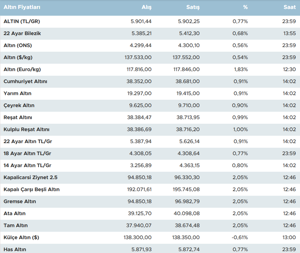 Gram altın alış fiyatı 5.901,44 TL, satış fiyatı 5.902,25 TL seviyesinde olup günlük değişim yüzde 0,77 artış gösteriyor ve son güncelleme 23:59 itibarıyla geçerli.