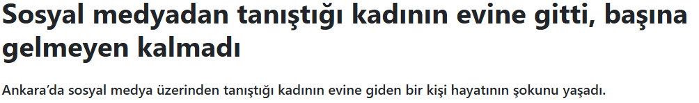 Ankara’nın Etimesgut ilçesinde, yalnızca internet üzerinden kurulan iletişimlerin ne denli tehlikeli sonuçlar doğurabileceğini gözler önüne seren dehşet verici bir gasp olayı yaşandı. Sosyal medya platformlarında tanıştığı A.Ü. isimli bir kadının davetine uyarak evine giden ve ismi öğrenilemeyen bir erkek, hayatının en büyük şokunu yaşayarak kendini bir tuzak içinde buldu. Kadının kurbanı eve davet etmesiyle başlayan bu olaylar zinciri, organize bir suç eyleminin parçası olduğu anlaşıldı.