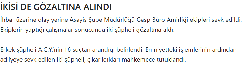 Gözaltına alınan erkek şüpheli A.C.Y.’nin geçmişi ise polisleri dahi şaşırttı. Yapılan incelemelerde A.C.Y.’nin tam 16 farklı suçtan arandığı belirlendi. Emniyetteki işlemlerinin tamamlanmasının ardından adliyeye sevk edilen iki şüpheli, çıkarıldıkları mahkeme tarafından tutuklanarak cezaevine gönderildi. Bu olay, sosyal medyada başlayan ilişkilerin ne kadar büyük riskler taşıyabileceği konusunda bir kez daha uyarı niteliği taşıyor. Sosyal medya platformları üzerinden tanışılan kişilere karşı her zaman tedbirli olmak gerektiği unutulmamalıdır.