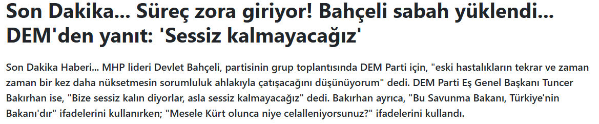 DEM Parti'nin açıklamalarını sorunlu bir dil olarak değerlendiren Bahçeli, partinin "Türkiye'yi uyarıyoruz" şeklindeki sözlerini YPG'yi aklama niyeti olarak gördü. Terörsüz bir ortamın adım adım gerçekleştiği süreçte Halep gerekçesiyle sokaklara dökülmenin istismar olduğunu belirten lider, bunun kimseye kazanç sağlamayacağını söyledi. SDG/YPG ile Ankara'da müzakere isteğini aceleci veya akıl tutulması olarak nitelendiren Bahçeli, İsrail güdümündeki bir örgütle pazarlığın nasıl olacağını sordu. Muhatabın İmralı'dan başkası olmadığını net bir şekilde ifade etti.
