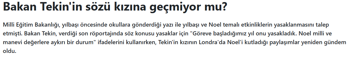 Bakan Tekin'in bu açıklamaları, kamuoyunda geniş yer bulurken, dikkatleri başka bir detaya çevirmiştir. Tekin'in kızı Nihan Elif Tekin'in geçmişte yaptığı bir sosyal medya paylaşımı, bu tartışmaların ortasında yeniden gündeme gelmiştir. Londra'da eğitim gördüğü dönemde TikTok hesabı üzerinden paylaşımda bulunan Nihan Elif Tekin, Noel etkinliklerine katıldığını belirten bir gönderi yapmıştır.