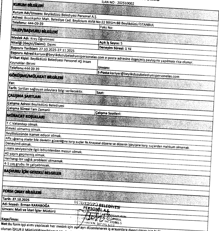 İstanbul'da ikamet eden ve kariyerine kamu bünyesinde devam etmek isteyen Kreş Öğretmenleri için heyecan verici bir gelişme yaşandı. Beylikdüzü Belediyesi Personel A.Ş., kadrosunda daimi olarak görevlendirmek üzere personel alımı yapacağını duyurdu. Yayınlanan ilan formu, 5 Kreş Öğretmeni pozisyonu için başvuruların başladığını gösteriyor. Bu önemli istihdam hamlesi, Beylikdüzü Belediyesi'ne bağlı bir şirket tarafından yürütülüyor ve yeni çalışanlar Tam Zamanlı statüde görev yapacak.