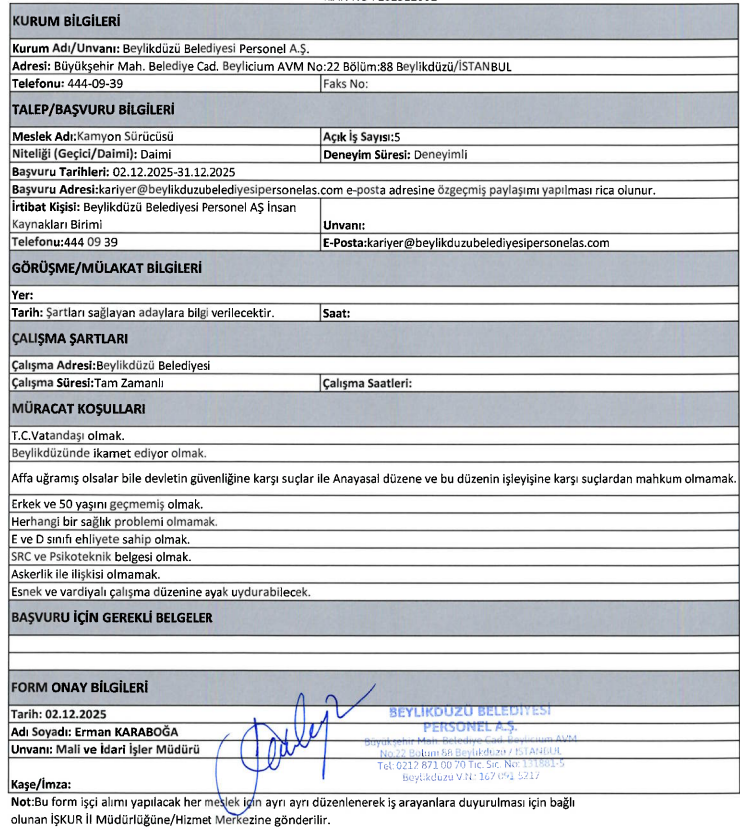 Belediye şirketi tarafından duyurulan bu alımda, istihdam edilecek pozisyon Kamyon Sürücüsü olarak belirlendi. Kurum dışı kamu işçi alımı statüsünde gerçekleştirilecek olan bu alımda toplamda 5 açık iş sayısı bulunuyor. İşe alınacak personellerin geçici değil, daimi süreli olarak istihdam edileceği vurgulandı. İş arayanlar için büyük bir fırsat niteliği taşıyan bu ilanda, adayların belirli mesleki ve genel şartları taşımaları gerektiği ifade edildi.