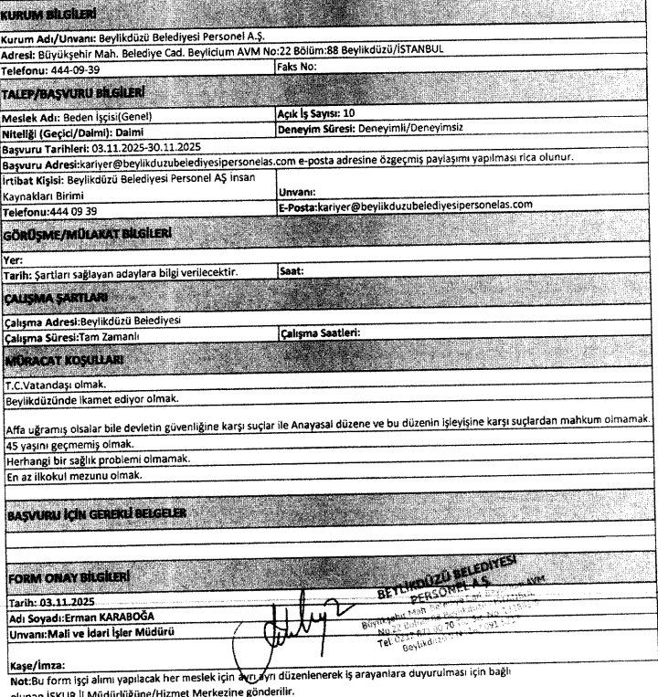 İlanı yayımlayan kurum, Beylikdüzü Belediyesi Personel A.Ş.'dir ve bu şirket doğrudan Beylikdüzü Belediyesi'ne bağlı olarak hizmet vermektedir. Şirketin resmi adresi Büyükşehir Mah. Belediye Cad. Beylicium AVM No:22 Bölüm:88 Beylikdüzü/İSTANBUL olarak belirtilmiştir. Alınacak personel, tam zamanlı çalışma süresiyle Beden İşçisi (Genel) pozisyonunda, Beylikdüzü Belediyesi'nin çalışma adreslerinde görev yapacaktır. Kurum dışı kamu işçi alımı olarak yayımlanan bu formun İŞKUR İl Müdürlüğü'ne gönderildiği bilgisi de bulunmaktadır. Başvuru için gerekli belgeler başlığı altında kurum tarafından herhangi bir evrak detayı verilmemiş olup, başvurunun e-posta ile özgeçmiş paylaşımı şeklinde yapılacağı teyit edilmiştir. Adayların özgeçmişlerinde (CV) başvuru şartlarını sağladıklarını belirten tüm bilgileri doğru ve eksiksiz olarak paylaşmaları büyük önem taşımaktadır. Bu ilan, Beylikdüzü'nde istikrarlı ve güvenceli bir daimi iş fırsatı yakalamak isteyen herkes için son derece önemli bir kapı aralamaktadır.