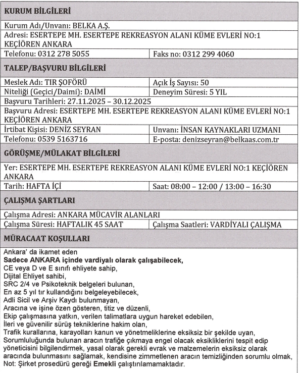 Bu büyük istihdam hamlesinin arkasındaki kurum olan BELKA A.Ş., bünyesinde görevlendirmek üzere tam 50 adet Tır Şoförü alımı yapacağını açıkladı. Alınacak personellerin geçici değil, daimi statüde istihdam edileceği belirtilirken, iş arayanlar için bu durum uzun vadeli bir iş güvencesi anlamına geliyor. Başvuru süreci 27 Kasım 2025 tarihinde başlamış olup, ilgilenen adayların 30 Aralık 2025 tarihine kadar gerekli işlemleri tamamlamaları büyük önem taşıyor.
