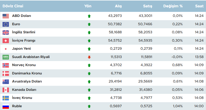 Güncel veriler, çoğu para biriminde hafif ila orta düzeyde yükseliş eğilimi gösteriyor. Değişim oranları yüzde 0,03 ile 1,24 arasında pozitif seyrederek piyasa iyimserliğini yansıtıyor.