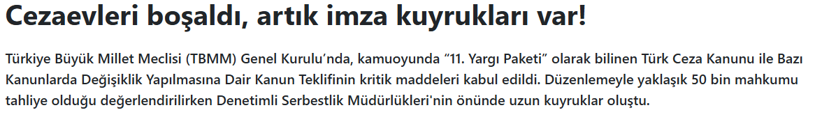 TBMM Genel Kurulu'nda kabul edilen 11. Yargı Paketi olarak bilinen kanun değişikliği, hükümlülerin infaz sürecinde önemli kolaylıklar sağlıyor. Suç işlendiği tarihten önce geçerli olan kurallara göre, kapalı cezaevinden açık cezaevine veya açık cezaevinden denetimli serbestliğe geçiş üç yıl daha erken gerçekleşebiliyor. Bu düzenleme sayesinde yaklaşık 50 bin mahkûmun tahliye yolunun açıldığı belirtiliyor.