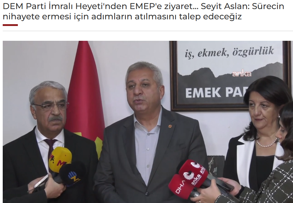 Ziyaret sırasında, EMEP Genel Başkanı Seyit Aslan ile DEM Parti heyeti arasında terörsüz Türkiye ve bölge hedefi doğrultusunda görüş alışverişinde bulunuldu. Aslan, sürecin sağlıklı bir şekilde ilerlemesi için tüm partilerin üzerine düşen sorumluluğu yerine getirmesi gerektiğini vurguladı. Özellikle İmralı'daki görüşmelerin katkısıyla, kalıcı çözümün kapısının aralandığına dikkat çekti.