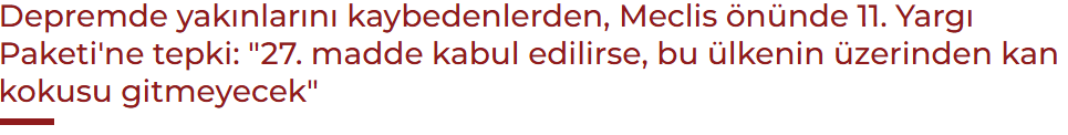 Eylemciler, 11. Yargı Paketi'nin 27. maddesinin deprem suçlularını kapsayacak şekilde düzenlenmesine sert tepki gösterdi. Bu madde kabul edilirse, enkaz altında kalan binlerce canın sorumlularının cezasızlıkla karşılaşacağı endişesi hakim. Aileler, "27. madde kabul edilirse bu ülkenin üzerinden kan kokusu gitmeyecek" diyerek öfkelerini dile getirdi.