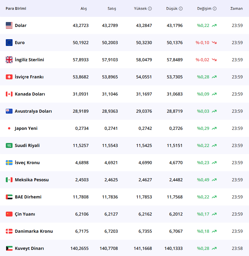 16 Ocak 2026 tarihi itibarıyla son güncelleme saat 23:59'da gerçekleştirilen döviz kurları, önemli para birimleri için şu değerleri göstermektedir. Amerikan Doları alış fiyatı 43,2723 lira, satış fiyatı ise 43,2789 lira seviyesindedir. Günlük değişim yüzde 0,22 oranında artış yönündedir. Doların yüksek seviyesi 43,2847 lira, düşük seviyesi ise 43,1796 lira olarak kaydedilmiştir.