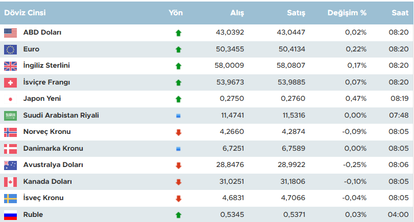Serbest piyasa verilerine göre Amerikan Doları alış fiyatı 43,0320 TL seviyesinde bulunurken, satış fiyatı 43,0381 TL olarak kaydedildi. Bu değerler, önceki kapanışa kıyasla yüzde 0,02 oranında bir artış gösteriyor. Euro ise alışta 50,3062 TL, satışta 50,3264 TL bandında işlem gördü ve yüzde 0,01'lik hafif bir yükseliş yaşadı. İngiliz Sterlini alış 57,9747 TL, satış 58,0173 TL ile yüzde 0,19 oranında gerileme gösterdi.