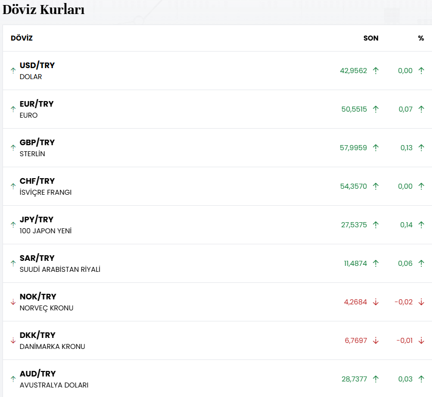 100 Japon Yeni, yüzde 0,14'lük artışla en hareketlilerden biri olurken, Suudi Arabistan Riyali yüzde 0,06 yükseliş sergilemiş. Norveç Kronu yüzde -0,02'lik hafif düşüş, Danimarka Kronu yüzde -0,01 değişimle dengeli bir tablo çiziyor. Avustralya Doları yüzde 0,03, Kanada Doları yüzde 0,04 artışla pozitif kapanmış.