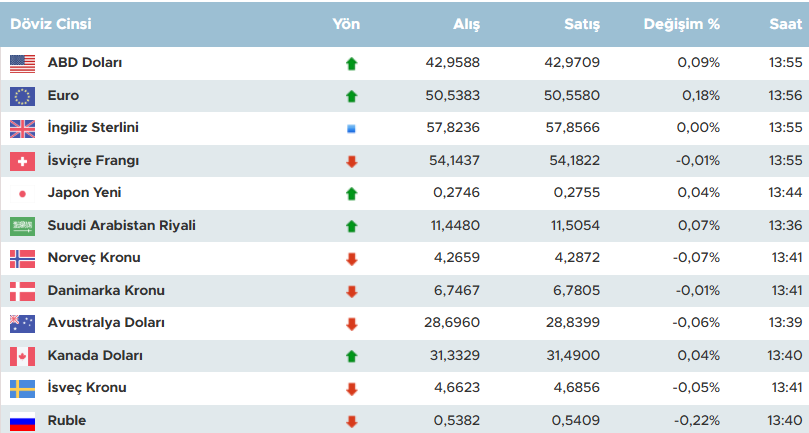 Kuzey Avrupa para birimleri de hareketli; Norveç Kronu alış 4,2662 TL, satış 4,2876 TL ve yüzde -0,06 düşüşle, Danimarka Kronu alış 6,7425 TL, satış 6,7763 TL yüzde -0,07 gerilemeyle, İsveç Kronu ise alış 4,6555 TL, satış 4,6789 TL ve yüzde -0,20 değişimle izleniyor.