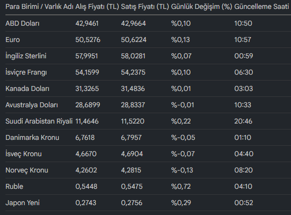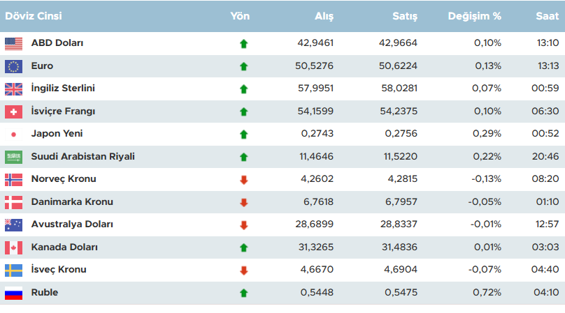 Dolar kuru canlı olarak izleyenler, son verilere göre ABD Doları alış fiyatının 42,9461 TL, satış fiyatının ise 42,9664 TL olduğunu görüyor. Bu değerler, yüzde 0,10'luk bir artışla dikkat çekiyor ve saat 10:50 itibarıyla güncellenmiş. Euro ne kadar sorusu ise en popüler aramalar arasında yer alıyor; Euro alış 50,5276 TL, satış 50,6224 TL seviyesinde seyrederken, yüzde 0,13'lük yükseliş kaydedilmiş ve güncelleme saati 10:57.