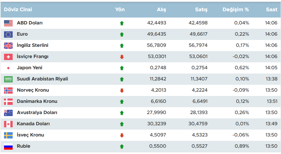 Daha geniş bir perspektiften bakıldığında, Suudi Arabistan Riyali/TRY saat 09:32'de alış 11,2725 TL ve satış 11,3290 TL ile değişim göstermedi. Norveç Kronu/TRY ise saat 09:38 itibarıyla alış 4,2005 TL, satış 4,2215 TL ve yüzde 0,11'lik bir gerileme kaydetti. Danimarka Kronu/TRY de aynı saatte alış 6,6016 TL, satış 6,6347 TL ile yüzde 0,09 düşüşteydi. Avustralya Doları/TRY alış 27,9502 TL ve satış 28,0903 TL ile yüzde 0,08 yükselirken, Kanada Doları/TRY alış 30,2831 TL, satış 30,4349 TL ve yüzde 0,13 geriledi. İsveç Kronu/TRY alış 4,5056 TL, satış 4,5282 TL ile yüzde 0,15'lik bir kayıp yaşadı. Ruble/TRY ise saat 14:06'da alış 0,5483 TL, satış 0,5510 TL ve yüzde 0,58'lik en belirgin artışlardan birini gösterdi. Bu veriler, bölgesel ekonomik dinamiklerin döviz kurlarına nasıl yansıdığını ortaya koyuyor ve uzun vadeli stratejiler için temel oluşturuyor.
