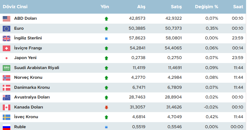 ABD Doları, alışta 42.8797 TL ve satışta 42.9259 TL seviyelerinden işlem görerek yüzde 0.19 oranında artış göstermiş durumda. Bu rakamlar, dolar TL kuru canlı takip edenler için dikkat çekici bir yükseliş sinyali veriyor.