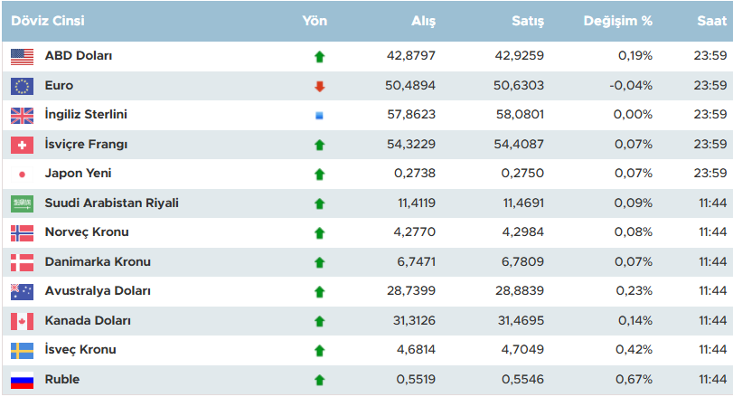 Bu hareketlilik diğer para birimlerinde de kendini gösteriyor; İsviçre Frangı alış 54,3229 TL, satış 54,4087 TL yüzde 0,07 artışla dikkat çekerken, Japon Yeni alış 0,2738 TL, satış 0,2750 TL yine yüzde 0,07'lik yükseliş kaydediyor. Suudi Arabistan Riyali alış 11,4119 TL, satış 11,4691 TL yüzde 0,09 artış gösterirken saat 11:44 verisiyle, Norveç Kronu alış 4,2770 TL, satış 4,2984 TL yüzde 0,08; Danimarka Kronu alış 6,7471 TL, satış 6,7809 TL yüzde 0,07 oranında değer kazanıyor aynı saatte.