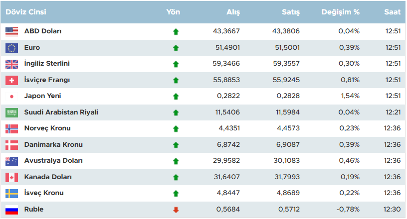 Norvec kronu alis 4,3724 lira, satis 4,4018 lira, yuzde -0,13. Suudi riyali alis 11,5210 lira, satis 11,5417 lira, yuzde -0,23. Isvec kronu alis 4,7673 lira, satis 4,8167 lira, yuzde -0,55.