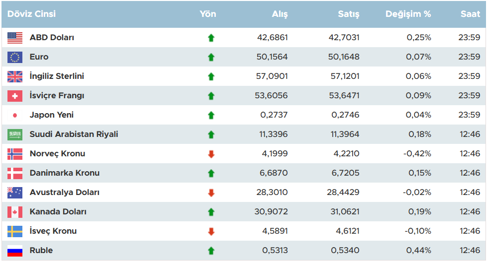 ABD Doları alış fiyatı 42,6861 TL, satış fiyatı 42,7031 TL seviyesinde ve yüzde 0,25 oranında artış göstermiş.