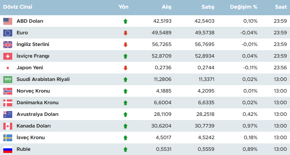 AUD/TRY Avustralya Doları ise dikkat çekici bir sıçramayla alışta 28,1109 TL'ye çıktı, %0,42'lik değişimle satış 28,2518 TL. Emtia rallisi ve RBA'nın şahin tutumu etkili; Türkiye'de maden ithalatçıları için fırsat. CAD/TRY Kanada Doları %0,97'lik bomba artışla 30,6204 TL alış, 30,7739 TL satış – petrol ve kereste talebi sürüyor. SEK/TRY İsveç Kronu 4,5017 TL'de %0,18 yükseldi, satış 4,5242 TL; İskandinav mobilya sektörünü besliyor. RUB/TRY Rus Rublesi %0,89'la 0,5531 TL alış, 0,5559 TL satış – Ukrayna sonrası yaptırımlara rağmen toparlanıyor, enerji ticaretinde rolü büyük.