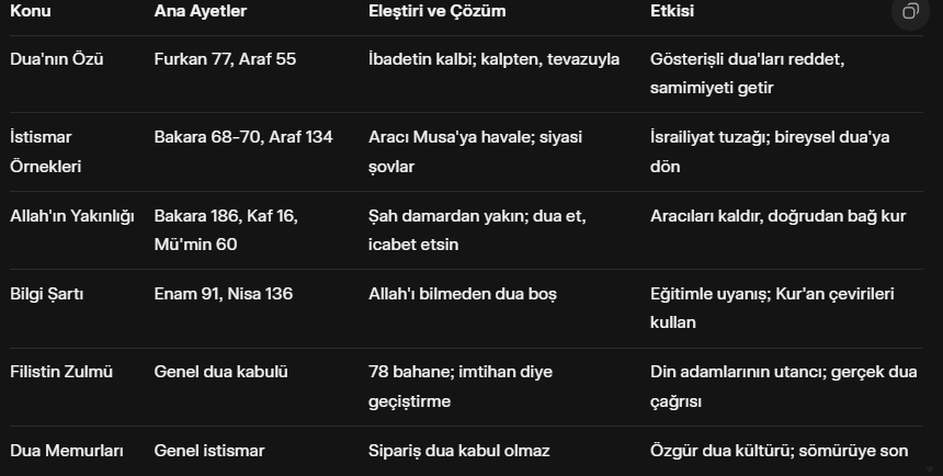 Dua istismarının küresel boyutu, sohbeti zenginleştiriyor. Amerikalı sunucunun şeyhe sorusu, evrensel bir sorun: Mazlumların duaları neden kabul olmuyor? Şeyhin bahaneleri, dinin evrensel sömürüsünü gösteriyor. Türkiye'de ise, cami cemaatleri dua memurlarına bağımlı; bu, İsrailiyat'tan miras. Yılmaz, Kur'an çevirilerini (Türkçe, İngilizce, Azerice vb.) önererek, dua'yı herkesin erişimine açıyor. Dua'nın özü, tevazu: Gizli dua, açık dua fark etmez; kalp samimi olsun. Bu sohbet, dinin reformunu talep ediyor; aracıları kaldır, Allah'la doğrudan bağ kur.