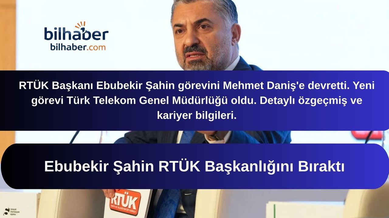 Radyo ve Televizyon Üst Kurulu (RTÜK) Başkanı Ebubekir Şahin, 6 yıllık görev süresinin ardından bugün yapılan seçimle koltuğunu Mehmet Daniş'e bıraktı. Şahin'in yeni ataması Kamuyu Aydınlatma Platformu'na bildirildi; Türk Telekom Genel Müdürü olarak görevlendirildi.