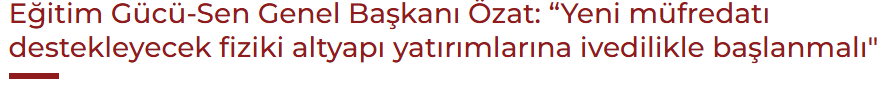 Özat, yetkililere seslenerek, müfredat değişikliğinin sadece içerikle sınırlı kalmaması gerektiğini belirtiyor. Fiziki altyapının güçlendirilmesi, yatırım planlarında öncelikli hale getirilmeli. Bu süreçte sendikaların görüşlerine daha fazla kulak verilmesi çağrısı da yapılıyor.