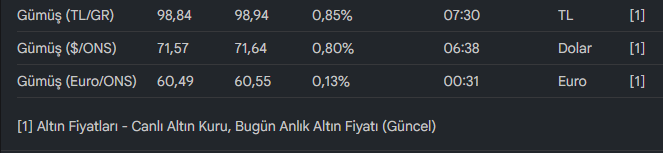 Gümüş fiyatları da altınla birlikte yakından izleniyor. Gümüş TL/gram alış 98,84 TL, satış 98,94 TL yüzde 0,85 artış ve saat 07:30 güncellemesiyle. Gümüş ons/dolar alış 71,57 dolar, satış 71,64 dolar yüzde 0,80 yükseliş, gümüş euro/ons alış 60,49 euro, satış 60,55 euro ve yüzde 0,13 değişimle tamamlıyor.