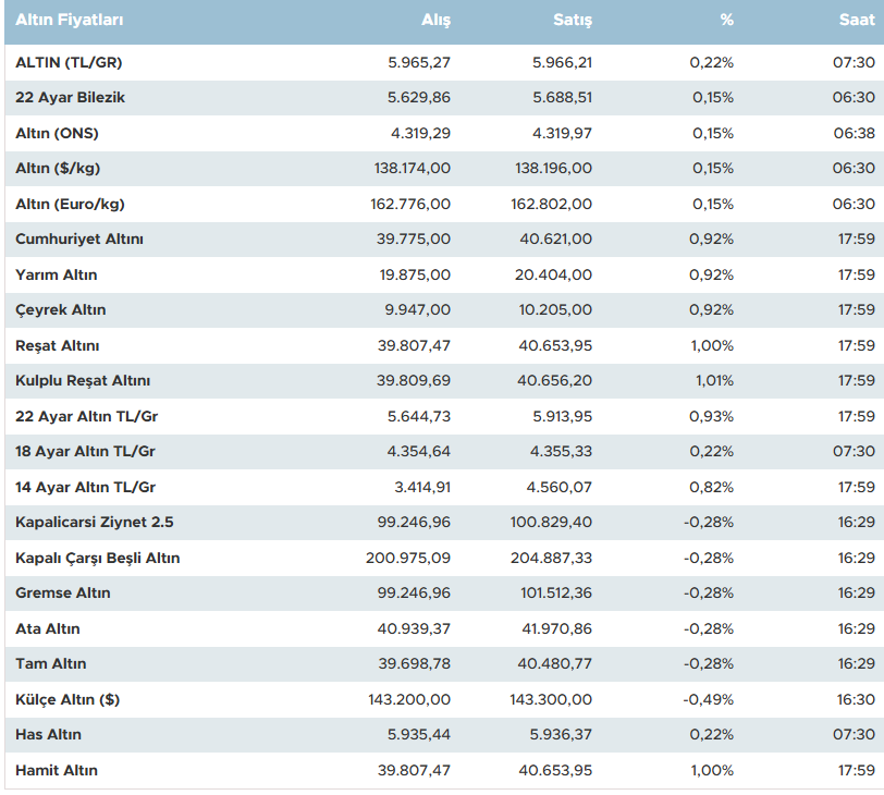 Daha büyük ziynetlerde Kapalıçarşı ziynet 2.5 alış 99.246,96 TL, satış 100.829,40 TL ve yüzde -0,28 değişim. Beşli altın alış 200.975,09 TL, satış 204.887,33 TL aynı yüzdeyle. Gremse altın alış 99.246,96 TL, satış 101.512,36 TL, Ata altın alış 40.939,37 TL, satış 41.970,86 TL ile yüzde -0,28'lik hareket dikkat çekiyor.