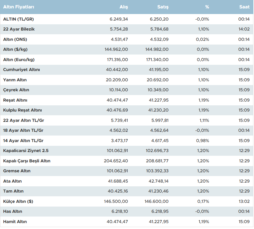 Ons altın fiyatı ise dolar bazında alışta 4.530,88 USD, satışta 4.531,47 USD olarak yüzde 1,16 artış göstermiş. TL bazında ons altın kilogram alışta 144.943,00 TL, satışta 144.962,00 TL; euro bazında ise alışta 124.424,00 Euro/kg, satışta 124.495,00 Euro/kg seviyelerinde.