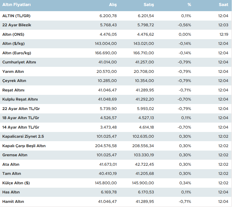 Çeyrek altın tarafında alış fiyatı 10.299,00 TL, satış fiyatı 10.368,00 TL şeklinde gerçekleşti ve yüzde 0,65'lik bir düşüş yaşandı. Yarım altın alış 20.599,00 TL, satış 20.737,00 TL ile aynı oranda gerilerken, tam altın alış 40.294,82 TL, satış 41.097,65 TL seviyesinde yüzde 0,90 düşüş gösterdi. Cumhuriyet altını alış 41.071,00 TL, satış 41.315,00 TL ile yüzde 0,65 geriledi.