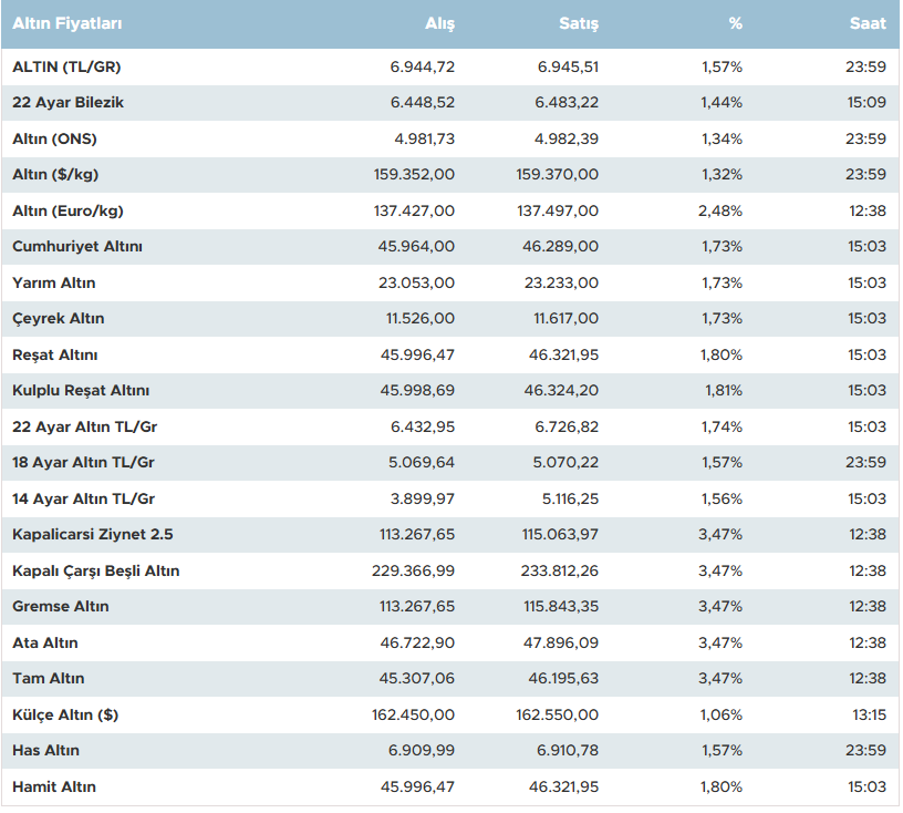 Gremse altın alış 113.267,65 TL, satış 115.843,35 TL olarak işlem görüyor. Ata altın alış 46.722,90 TL, satış 47.896,09 TL ile +3,47 değişim gösteriyor. Tam altın ise alış 45.307,06 TL, satış 46.195,63 TL seviyesinde bulunuyor.