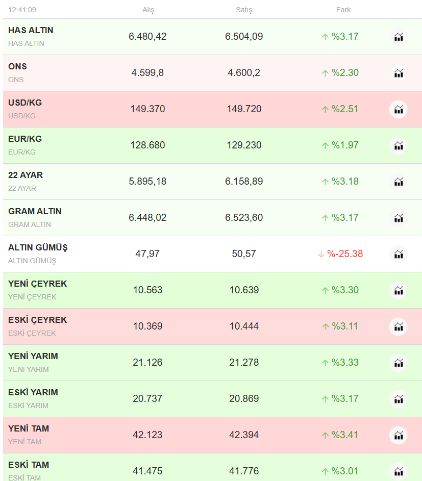Eski yarım altın alış 20.713 lira, satış 20.882 lira ile yüzde 3,24 artış kaydetti. Yeni tam altın alış 42.074 lira, satış 42.422 lira olarak yüzde 3,48 oranında yükseldi.