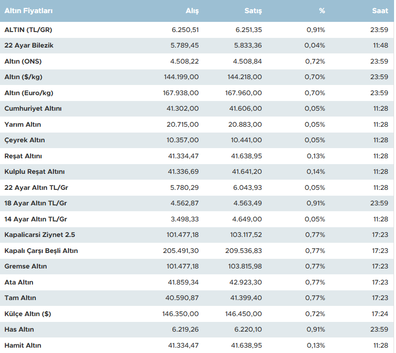 Uluslararası piyasalarda ons altın fiyatı da belirleyici rol oynuyor. Ons altın alış 4.508,22 USD, satış 4.508,84 USD ile yüzde 0,72 artış kaydediyor. Bu seviye, küresel gelişmelerin doğrudan yansıması niteliğinde. Altın ons kilogram bazında alış 144.199,00 USD, satış 144.218,00 USD. Euro cinsinden kilogram altın alış 167.938,00 Euro, satış 167.960,00 Euro. Külçe altın dolar bazında alış 146.350,00 USD, satış 146.450,00 USD.