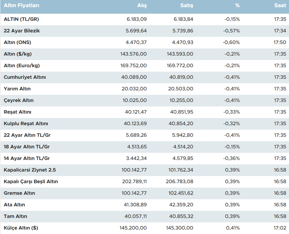 Çeyrek altın kategorisinde alış 10.016,00 TL, satış 10.242,00 TL olarak belirlenmiş durumda ve yüzde 0,53 oranında gerileme var. Yarım altın için alış fiyatı 20.014,00 TL, satış 20.478,00 TL iken aynı oranda düşüş gözleniyor. Tam altın alış 40.057,11 TL, satış 40.855,32 TL ile yüzde 0,39 artış gösterirken, Cumhuriyet altını alış 40.053,00 TL, satış 40.768,00 TL ve yüzde 0,53 düşüşle işlem görüyor. Reşat altını da alış 40.085,47 TL, satış 40.800,95 TL seviyelerinde, değişim yüzde 0,45 düşüş yönünde.
